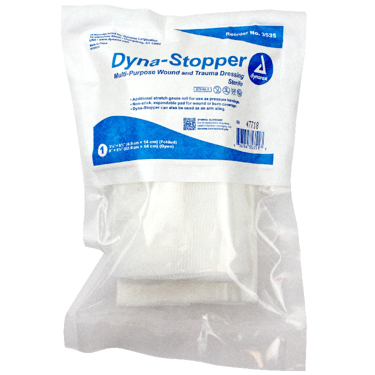 The Dynarex Code Blue Care Dyna-Stopper Trauma Dressing is a multi-purpose wound and trauma dressing that provides customized levels of compression to injuries. The Dyna-Stopper Trauma Dressing features extra padding to effectively control bleeding and exudate while helping to prevent pooling.Â