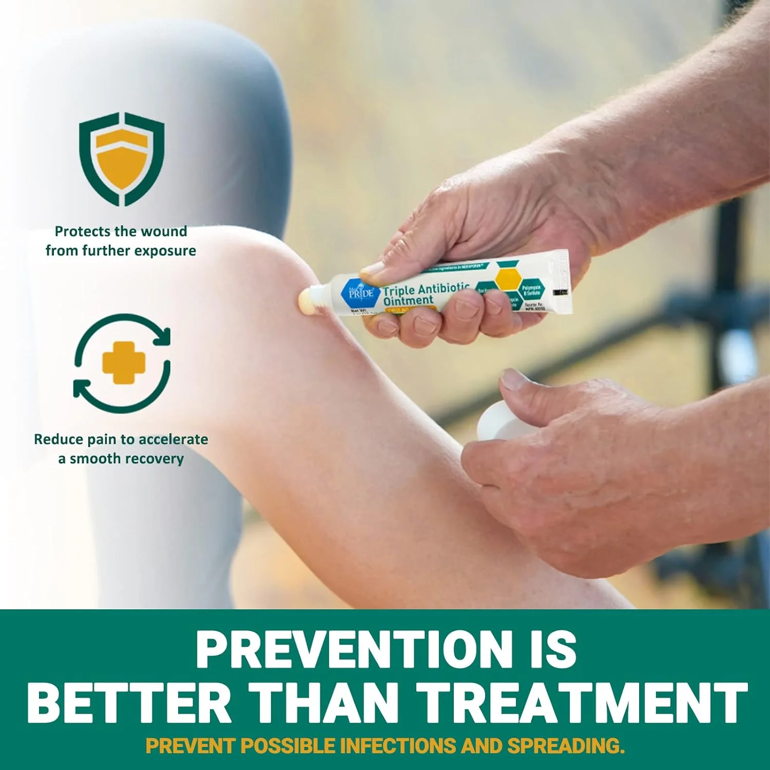 MedPride Triple Antibiotic Ointment. A 24-hour first-aid antibiotic ointment designed for minor wounds, scratches, and abrasions, this preventative formula contains a powerful combination of zinc, neomycin, and polymyxin. It helps protect and promote healing, providing round-the-clock care to keep your skin safe and healthy.